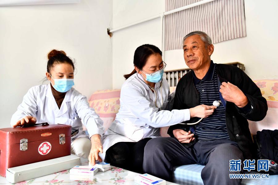 2020年11月11日,在山東省濰坊市寒亭區寒亭街道東院社區,衛生室醫生王紅霞(中)為村民張勇臣看病。寒亭區探索實施醫保服務下沉舉措,構建起覆蓋全區基層醫療機構的醫保服務下沉網絡,讓群眾在家門口便捷地享受醫保紅利。新華社記者 郭緒雷 攝