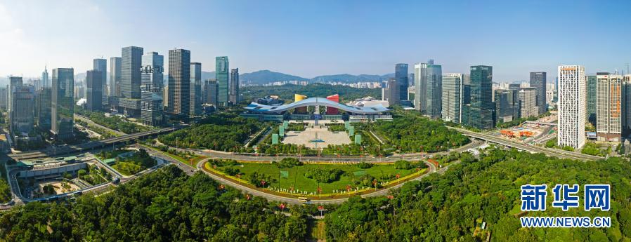這是2020年10月2日拍攝的深圳市民中心和蓮花山公園一線(無人機照片)。新華社記者 梁旭 攝