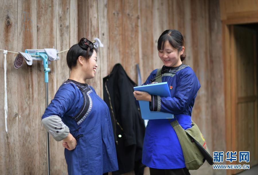 貴州省黔東南苗族侗族自治州榕江縣平江鎮(zhèn)巴魯村網格員劉園(右)走訪結對幫扶戶時,與村民韋福琴核對生產生活情況(2020年11月16日攝)。新華社記者 楊楹 攝