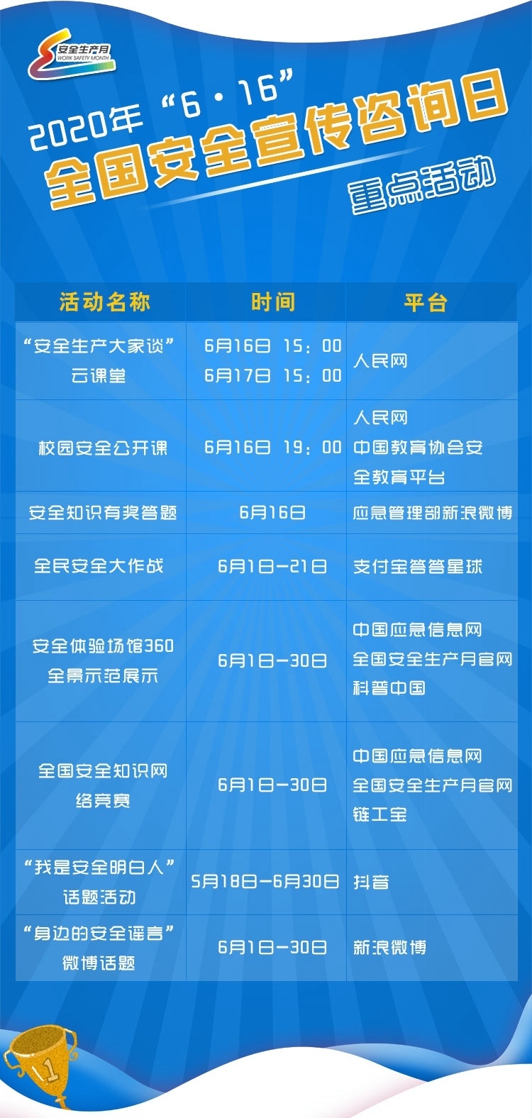 6月16日是全國安全宣傳咨詢日,按照國務院安委會辦公室、應急管理部統一要求,在應急管理部新聞宣傳司指導下,在人民網、支付寶、抖音、新浪微博、科普中國網等新媒體平臺,開展“安全生產大家談”云課堂、校園安全公開課、安全知識有獎答題、安全體驗場館360全景示范展示等系列活動,學習安全知識的同時,還可獲得各種獎品,福利多多、好處多多,詳情請關注中國應急信息網和全國安全生產月官網。具體活動預告如下: