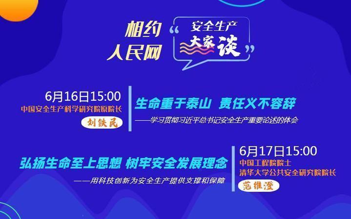 6月16日起,與知名專家、企業安全生產負責人和一線技術工人相約人民網,圍繞安全生產責任落實、隱患排查、風險管控、應急處置等內容,學習安全生產知識技能,交流心得體會。6月16日15:00,中國安全生產科學研究院原院長劉鐵民,講授學習貫徹習近平總書記關于安全生產重要論述體會;6月17日15:00,中國工程院院士、清華大學公共安全研究院院長范維澄,講授科技創新保障安全生產;其他講授內容陸續推出。