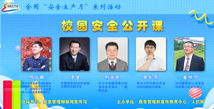 6月16日19:00登錄人民網,與北京地震局重大項目總技術指導邢成起、北京消防救援總隊原副總隊長李進、清華合肥公共安全研究院院長助理梁光華、張家口教育局科長崔祥烈、教育部某課題組長何衛國等5位專家,交流學習防震減災、消防安全、校園安全、陽光校園等方面內容,線上答疑釋惑,幫助提高學生應急避險和自救互救能力。
