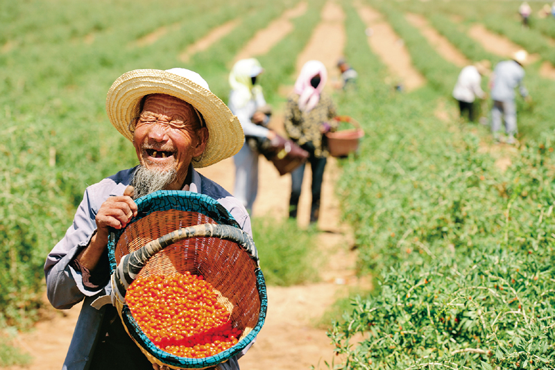 閩寧兩省區成功實現了援助式扶貧向開發式扶貧轉變。福建的人才、資金、技術、市場等要素與寧夏貧困地區的土地、特色農產品和勞動力資源有機結合,帶動了當地現代農業和特色優勢產業的發展。一個個特色優勢產業集群正在改變著西海固落后的生產結構和傳統的生活方式。圖為寧夏同心縣農民種植的枸杞喜獲豐收。 寧夏區委宣傳部供圖 李君杰/攝