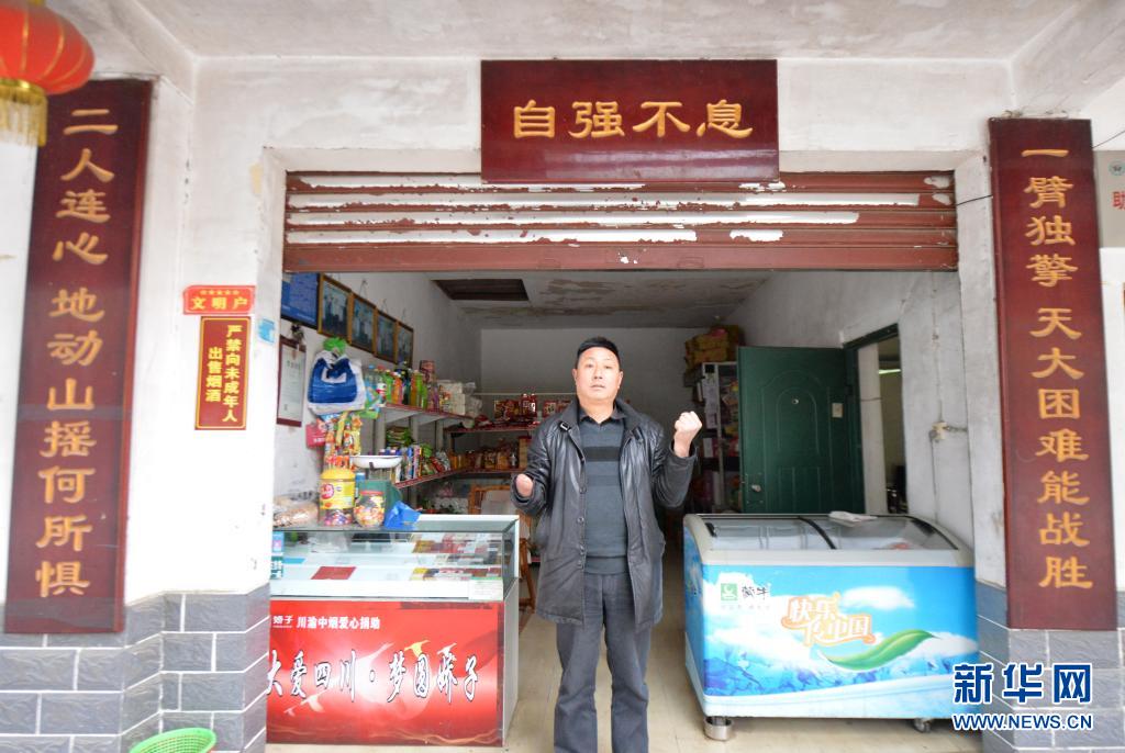 石光武小時候因事故致右手殘疾,妻子張正芳是聾啞人,他們一起努力,在村里開了一間小賣部。汶川大地震來襲時,石光武的住房和小賣部全部倒塌。在救援隊(duì)伍的幫助下,兩天后他就在路旁搭起兩間過渡房,臨時小賣部又開張了。