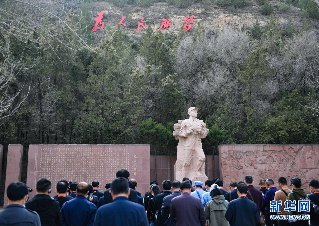 2021年3月29日,參觀者在延安市張思德廣場進行現場教學活動。新華社記者 張博文 攝