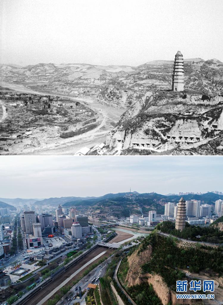 這是一張拼版照片,上圖為:1938年拍攝的延安(資料照片,新華社發);下圖為:2021年4月22日拍攝的延安市(無人機照片,新華社記者張博文攝 )新華社發