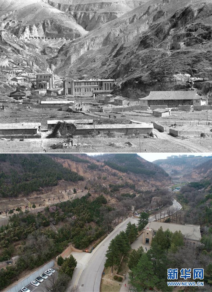 這是一張拼版照片,上圖為:1943年拍攝的延安楊家嶺——抗日戰爭時期黨中央所在地(吳印咸攝);下圖為:2021年4月21日拍攝的延安楊家嶺革命舊址(無人機照片,新華社記者張博文攝)。新華社發