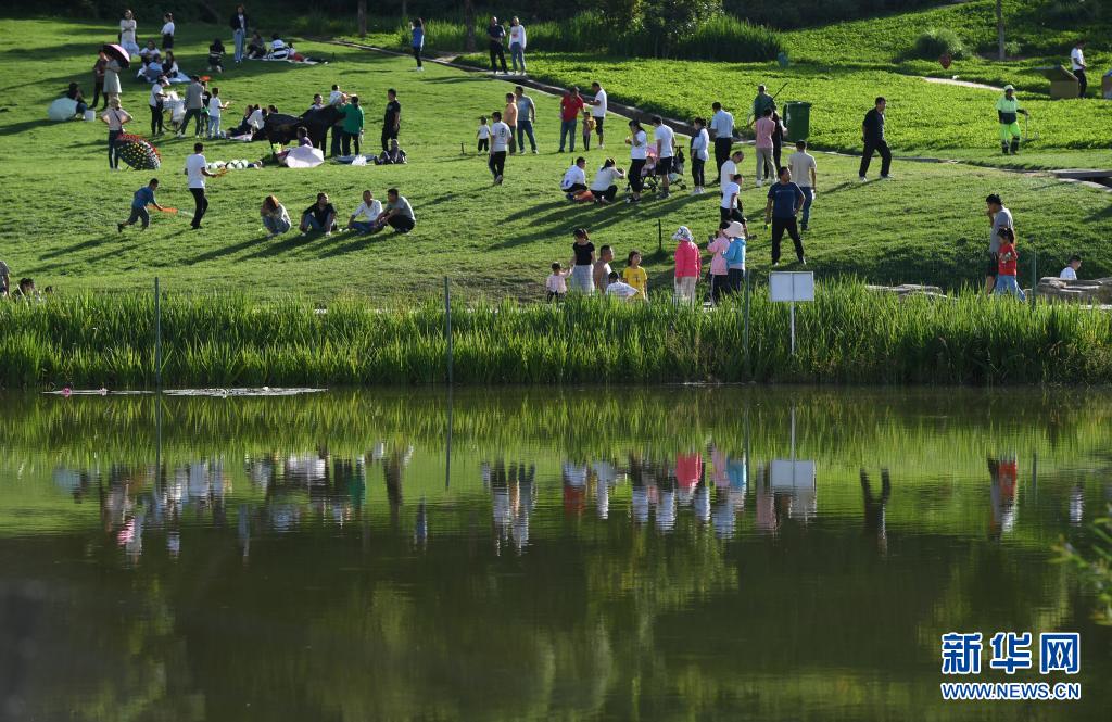 2020年8月19日,游人在位于延安市南泥灣景區的濕地公園游玩賞景。新華社發(祁小軍 攝)