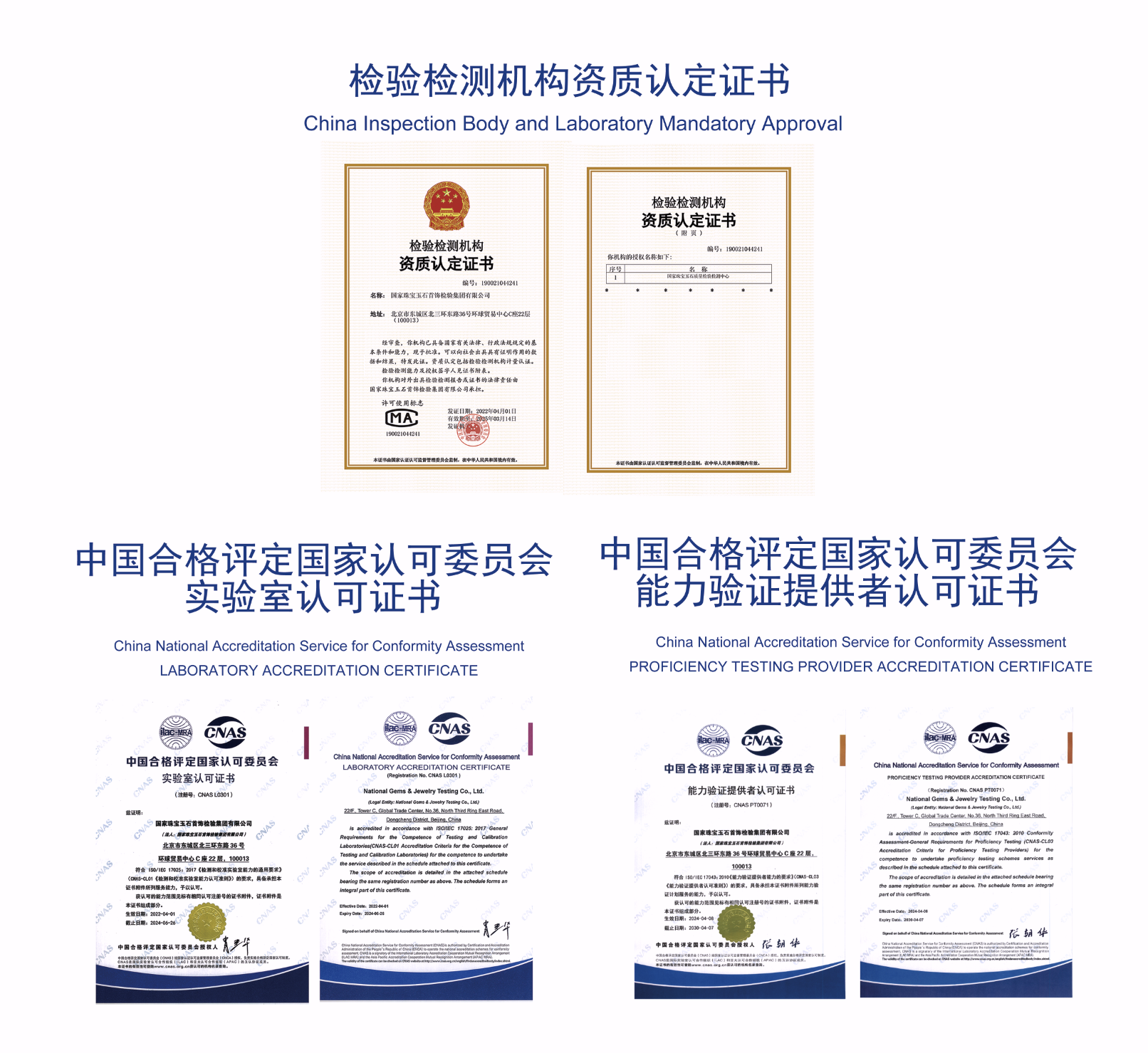 珠寶國檢是主管部門依法授權(quán)的珠寶玉石專業(yè)質(zhì)檢機構(gòu)。先后獲取檢驗檢測機構(gòu)資質(zhì)認定、中國合格評定國家認可委員會實驗室認可證書(CNAS L0301)以及中國合格評定國家認可委員會能力驗證提供者認可證書(CNAS PT0071)。