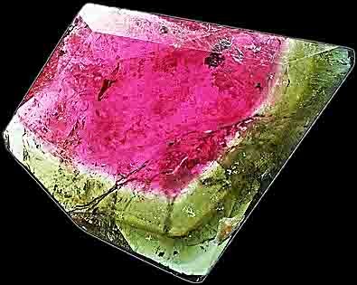 西瓜碧璽是碧璽家族中非常稀有的一個(gè)品種。一顆晶石里面,需要同時(shí)具備紅綠兩種色澤。由于其顏色酷似西瓜的果肉和果皮,因此得名“西瓜碧璽”。“從廣義上而言,只要顏色組合為紅綠二色的碧璽皆可稱(chēng)為西瓜碧璽。但高品質(zhì)的西瓜碧璽原礦則要求縱軸軸心是赤色,而軸心外沿是綠色。就如同一刀切開(kāi)的兩瓣西瓜一樣,周邊是一圈綠皮,中間是紅瓤。因此,能夠達(dá)到寶石級(jí)別的西瓜碧璽數(shù)量稀少。”中國(guó)地質(zhì)大學(xué)珠寶學(xué)院教師盧琪介紹道。