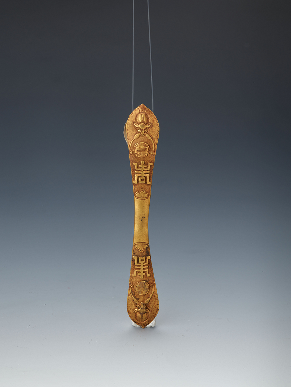 鏨刻福壽紋金發簪圈,清代,曲阜方家村出土,現藏于孔子博物館。發簪是古代男女常用的首飾,呈單股長針狀。最初的用途是綰束頭發。古代制作簪子的材質有金、銀、玉、銅、鐵等,充當著男女情愛的信物和談婚論嫁的聘物。唐·杜甫《春望》詩:“白頭搔更短,渾欲不勝簪。”
