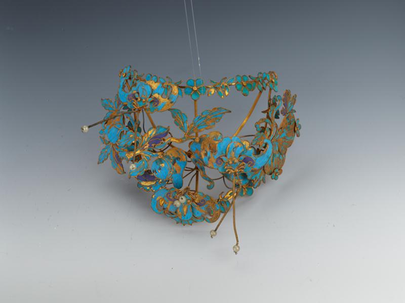 點翠鎏金“三多”銀頭花,清代,孔府舊藏。銀質鎏金;點翠飾佛手、蝙蝠、瓞瓜、壽桃、花卉等紋。寓意多福、多壽、多子。點翠首飾種類繁多,有鈿子、頭面、釵、簪、耳墜、扁方、勒子等。點翠技法十分復雜,首先以金屬制成特定底托,再以金屬線勾勒圖案、紋樣,其上涂上適量的膠水粘貼翠鳥羽毛,形成精美圖案,色彩鮮艷,精美華麗,并常鑲嵌珍珠、碧璽、珊瑚、翡翠、瑪瑙等,更顯典雅高貴。