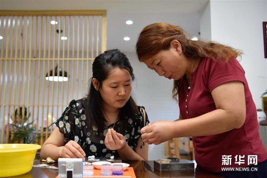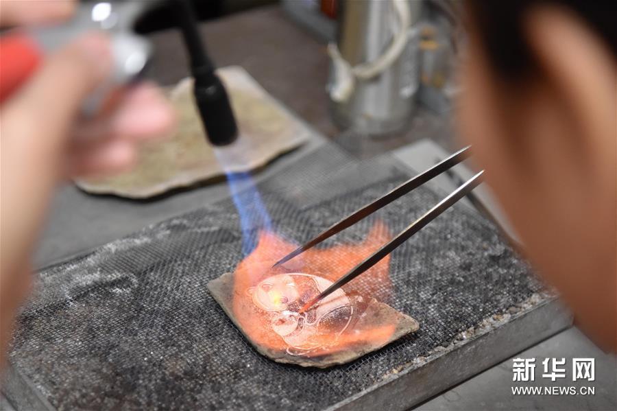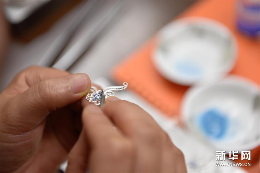 6月10日,在道安銀花絲工作室,匠人在進行琺瑯工序,為銀花絲上色。新華社發(胥冰潔攝)