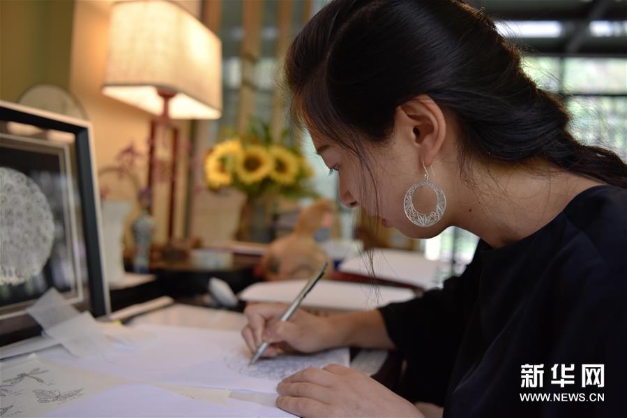 6月10日,在道安銀花絲工作室,王曉璐在繪制銀花絲設計圖案。新華社發(胥冰潔攝)