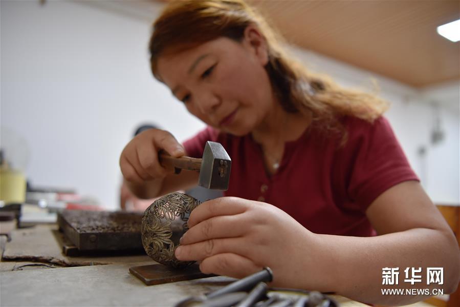 6月10日,在道安銀花絲工作室,道安在進行無胎成型,銀花絲制作中這一步需要匠人有高超的技藝。新華社發(胥冰潔攝)
