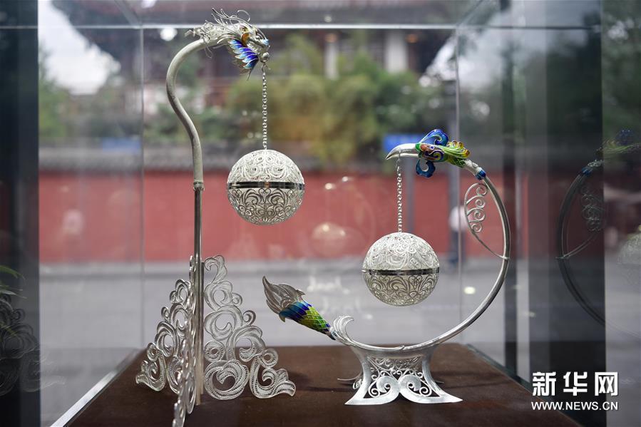 這是6月10日在道安銀花絲工作室內拍攝的銀花絲飾品。新華社發(胥冰潔攝)