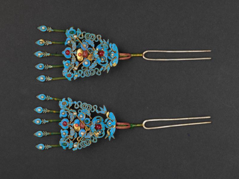 點翠嵌珠福壽紋銀釵,清代,孔府舊藏,現藏于孔子博物館。銀質鎏金;以點翠工藝飾蝙蝠、壽桃、雙錢、竹葉、花卉等紋,鑲嵌各色寶石裝飾。寓意福祿萬代,福至眼前。
