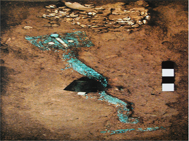 這件綠松石龍形器龍身長(zhǎng)64.5厘米,由2000余片菱形鱗紋綠松石片組合而成。巨頭蜷尾,龍身曲伏有致,色彩絢麗,形象生動(dòng)。扁圓形龍頭伸出多條龍須或鬢,吻部微突出,額面中脊、鼻梁明顯,鼻梁由三節(jié)半圓形的青、白玉柱組成,蒜頭狀鼻端由綠松石雕成,梭形眼眶對(duì)稱(chēng),眼珠為圓餅形白玉。距龍形器尾端不遠(yuǎn)處,還有一個(gè)綠松石條形飾,與龍?bào)w的角度近乎垂直,宛若一條游龍。