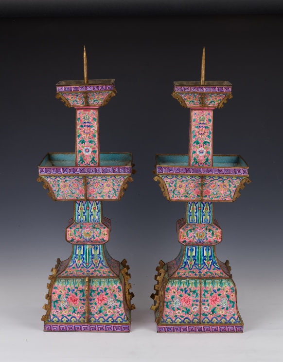 燭臺共兩件,形制相同。銅胎。由上下兩盤、承柱、方形高圈足組成,上盤內有銅釬用以插燭,方圈足微撇,器身飾扉棱。盤內壁施淺藍色琺瑯釉,外壁以粉色琺瑯釉為地,飾回紋、纏枝花卉紋、蕉葉紋、如意云頭紋等。