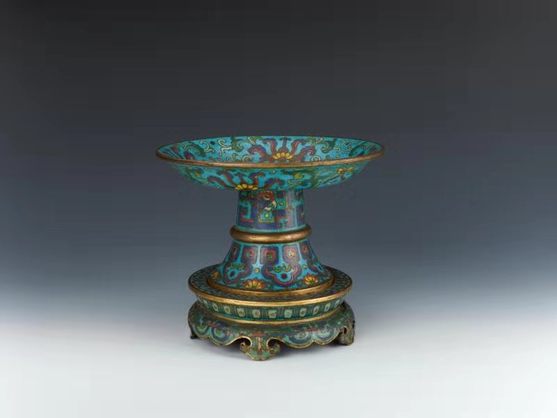 掐絲琺瑯寶相花紋高足盤,清代。銅胎鍍金,侈口、淺腹、喇叭形高圈足,束腰垂云式座。淺藍琺瑯釉為地,盤內外飾寶相花紋;足飾夔鳳、變形獸面紋、如意云頭等紋,中部有一鎏金箍;底座飾如意云頭、蓮瓣、變形夔龍等紋。此盤胎體厚重,紋飾布局疏密得當,掐絲線條流暢,釉色純正溫潤。