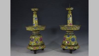 ——清雍正·黃地彩繪纏枝牡丹紋銅胎畫琺瑯燭臺