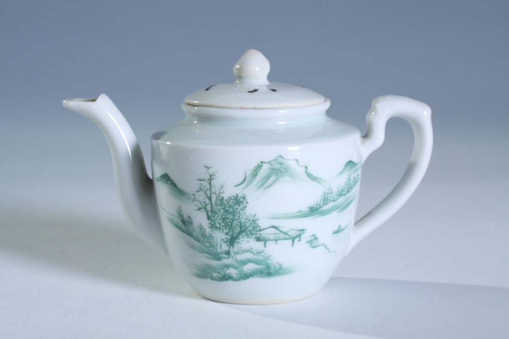 德化瓷器以白見長,兼燒青花、粉彩、五彩等彩器,以單一色裝飾品種并不多見。此壺正面所繪山水圖所呈現(xiàn)的綠色,相較粉彩或五彩彩器中的綠彩更為清亮,且彩料經(jīng)久不脫落,有釉下彩效果。