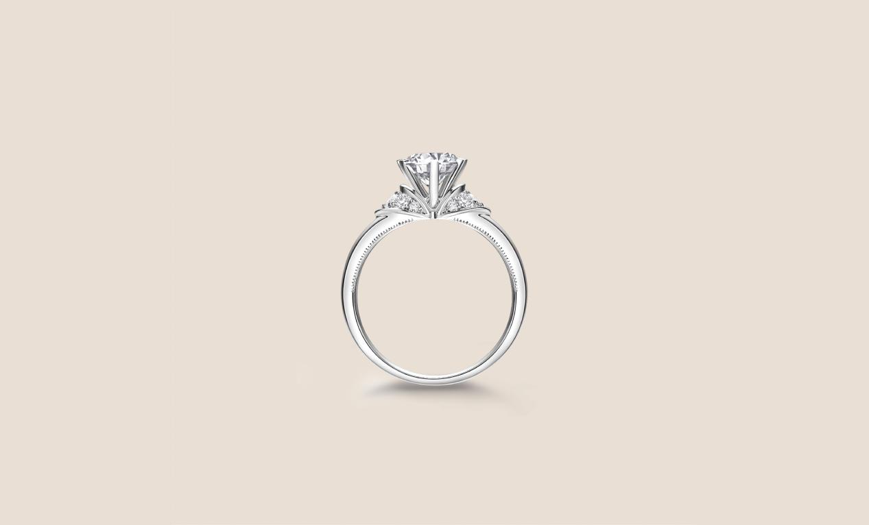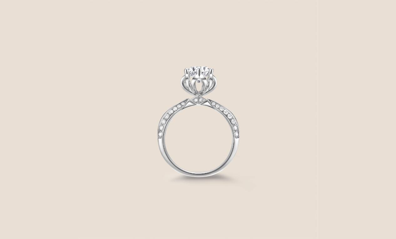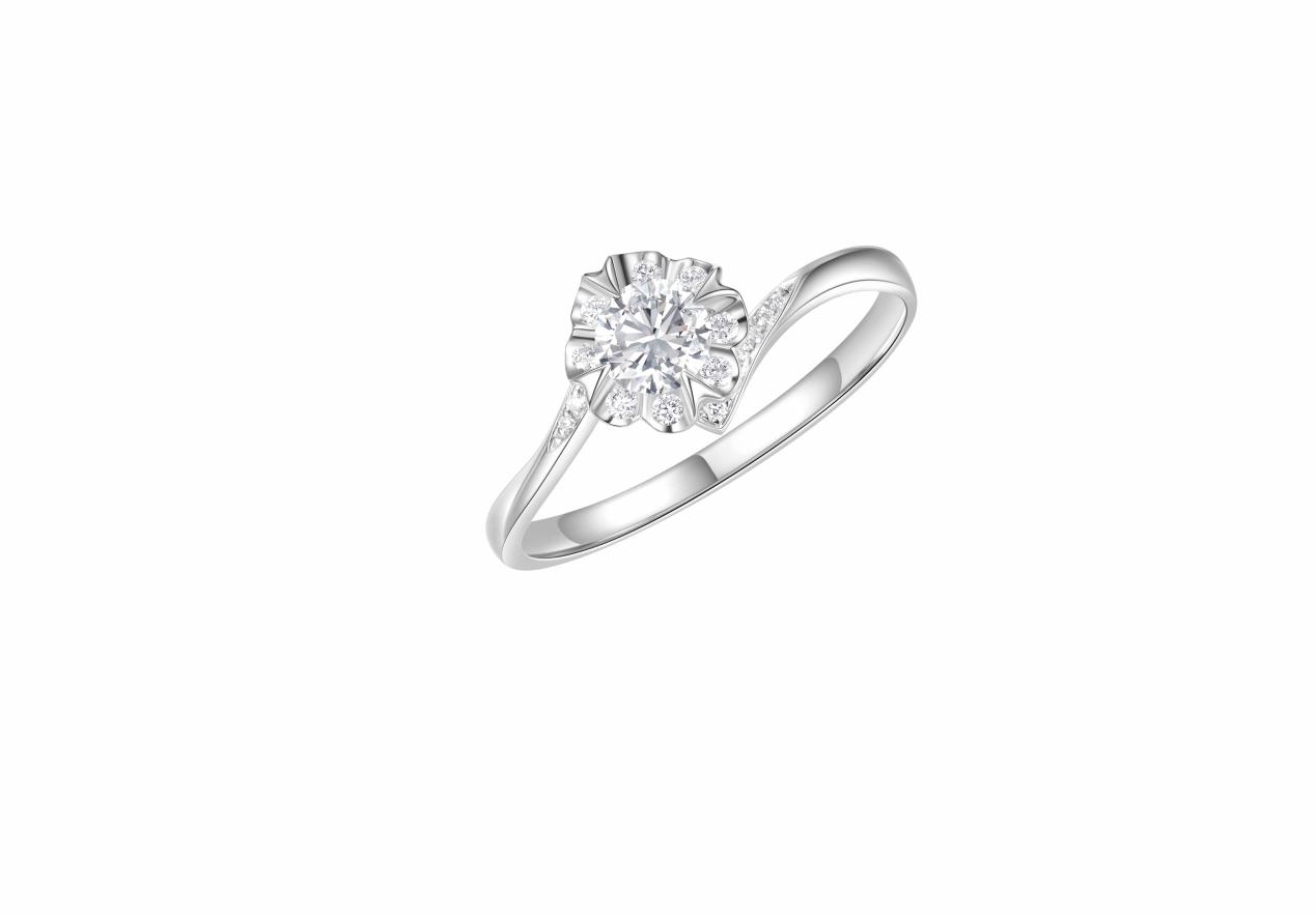 “芳華”鉆戒,簡潔鏤空的花瓣形六爪鑲嵌,襯托美鉆的耀目光芒,象征著女性如花朵盛開,燦爛輝煌。
