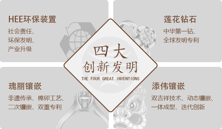 創(chuàng)新發(fā)明“HEE環(huán)保裝置”、“蓮花鉆石”、“瑰麗鑲嵌”、“添偉鑲嵌”等技術(shù)獲得多項(xiàng)全球發(fā)明專利,并入選教材《珠寶玉石學(xué)》和《商業(yè)首飾設(shè)計(jì)》中國珠寶品牌案例。