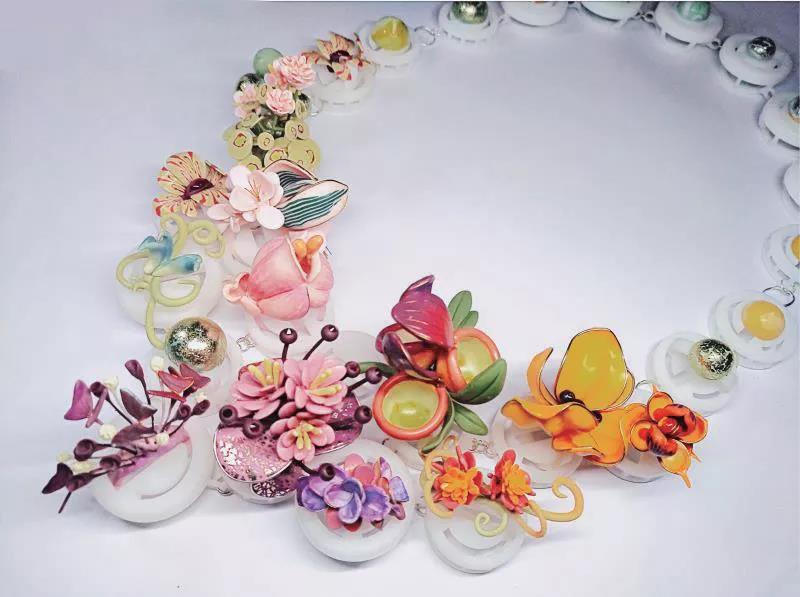 傳統珠寶首飾的色彩,主要由金屬本色和寶石色彩組成,局限性較大。而現代珠寶首飾,由于材料的不斷拓展和更新,色彩變得要加豐富和艷麗。作為與人互動密切的產品,首飾的色彩可以影響顧客的購買意向,所以在進行首飾設計時,要對色彩有深刻的理解和靈活的運用。