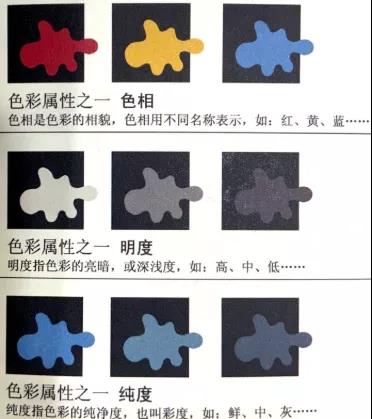 色彩的基本屬性分為色相、明度、純度,三者在任何一種顏色上同時存在。