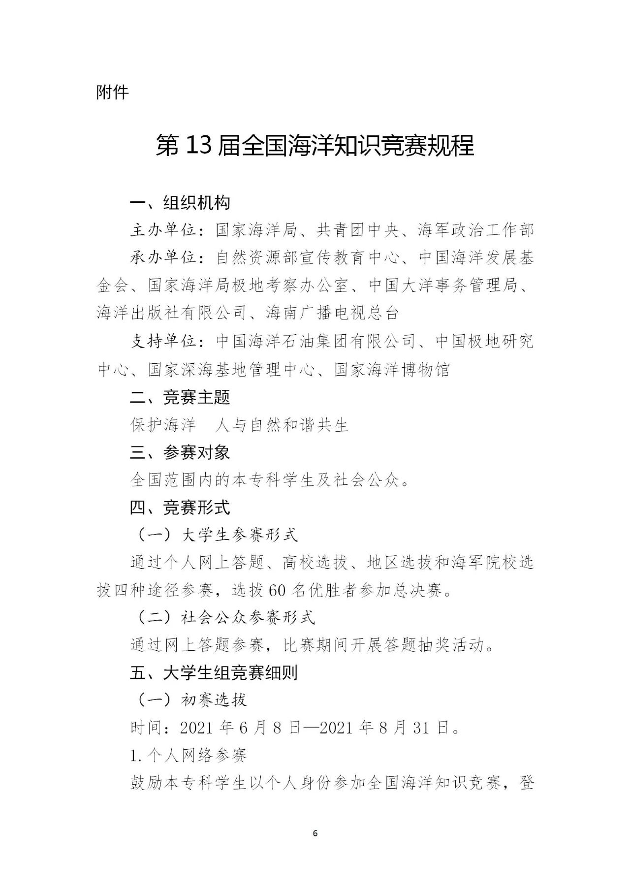 各省、自治區、直轄市及計劃單列市自然資源主管部門、團委,新疆生產建設兵團自然資源局、團委,上海市海洋局、福建省海洋與漁業局、山東省海洋局、廣西壯族自治區海洋局、廈門市海洋發展局、青島市海洋發展局,各有關院校,自然資源部、共青團中央、海軍所屬有關單位、機關有關司局: 為貫徹落實習近平總書記關于“進一步關心海洋、認識海洋、經略海洋”的重要指示精神,深入推進海洋強國建設,引導社會公眾學習海洋知識、增強海洋意識,牢固樹立“尊重自然、順應自然、保護自然”生態文明理念,國家海洋局、共青團中央、海軍政治工作部決定共同主辦第13屆全國海洋知識競賽。現將有關事項通知如下: 各單位要根據本地區疫情防控要求和實際情況,做好線上線下競賽的組織發動,聯系各高校遴選優秀選手參加全國大學生組總決賽,引導更多的大學生及社會公眾參加競賽活動。要充分借助電視、網絡、新媒體等各類宣傳平臺,廣泛開展競賽宣傳工作,擴大競賽活動的社會影響,引導社會公眾關心海洋、認識海洋,更好地利用海洋,促進人與自然和諧共生。 自然資源部宣教中心 蔡紫南 010-63881303 共青團中央青年發展部 蘭 彥 010-85212814 海軍政治工作部宣傳局 莫小亮 010-66960176自然資源辦公廳 共青團中央辦公廳 海軍政治工作部宣傳局