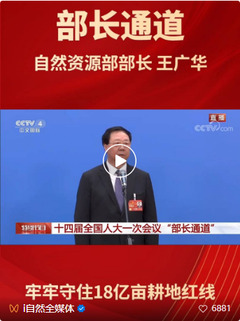 3月12日上午,第十四屆全國人民代表大會第一次會議舉行第三場“部長通道”采訪活動。自然資源部部長王廣華在“部長通道”,就牢牢守住18億畝耕地紅線、加強重要能源礦產資源勘探開發、推進生態保護和修復等社會各界關切的問題,回答了媒體記者的提問。