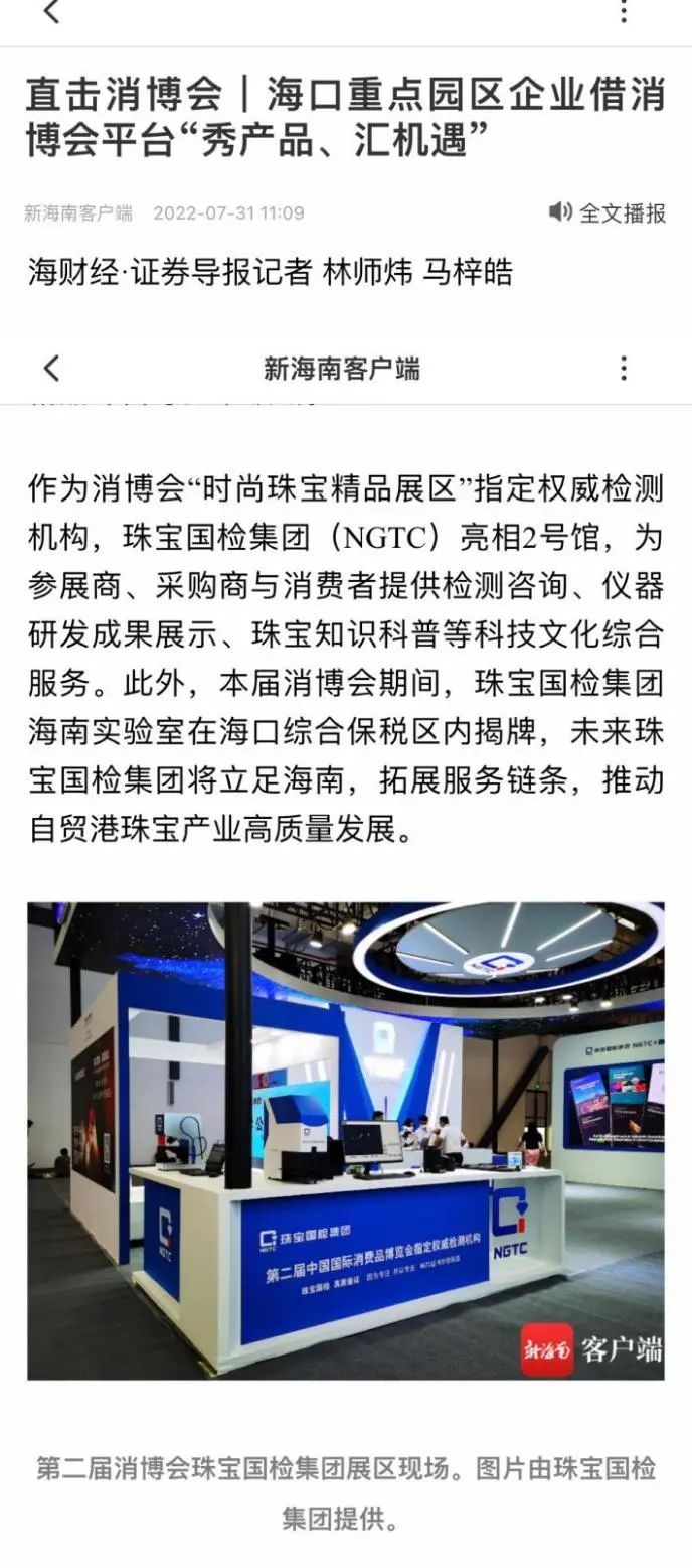 7月25日-30日,珠寶國檢集團受邀參加第二屆中國國際消費品博覽會(下簡稱消博會),作為權威的國家級珠寶檢測機構,珠寶國檢集團為消博會提供的綜合科技服務得到參展商、采購商、消費者的一致好評;在消博會期間,珠寶國檢集團受邀出席海口市招商引資推介會暨重點項目簽約儀式,珠寶國檢集團海南實驗室正式揭牌,以科技服務海南自貿港珠寶玉石產業發展。以上系列服務與舉措獲得海南電視臺新聞頻道、海南日報、海南日報客戶端、海口日報等媒體的關注與報道。