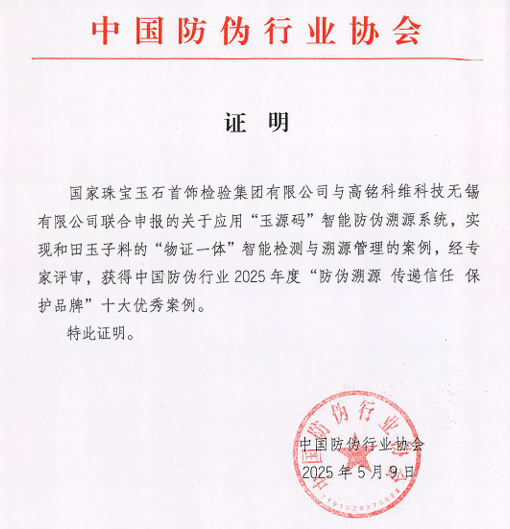 近日,中國防偽行業(yè)協(xié)會發(fā)布了2025年度“防偽溯源 傳遞信任 保護(hù)品牌 十大優(yōu)秀案例”,國家珠寶玉石首飾檢驗集團(tuán)有限公司(國家珠寶玉石質(zhì)量檢驗檢測中心)聯(lián)合高銘科維科技公司推出的“玉源碼”智能防偽溯源系統(tǒng)成功入選。