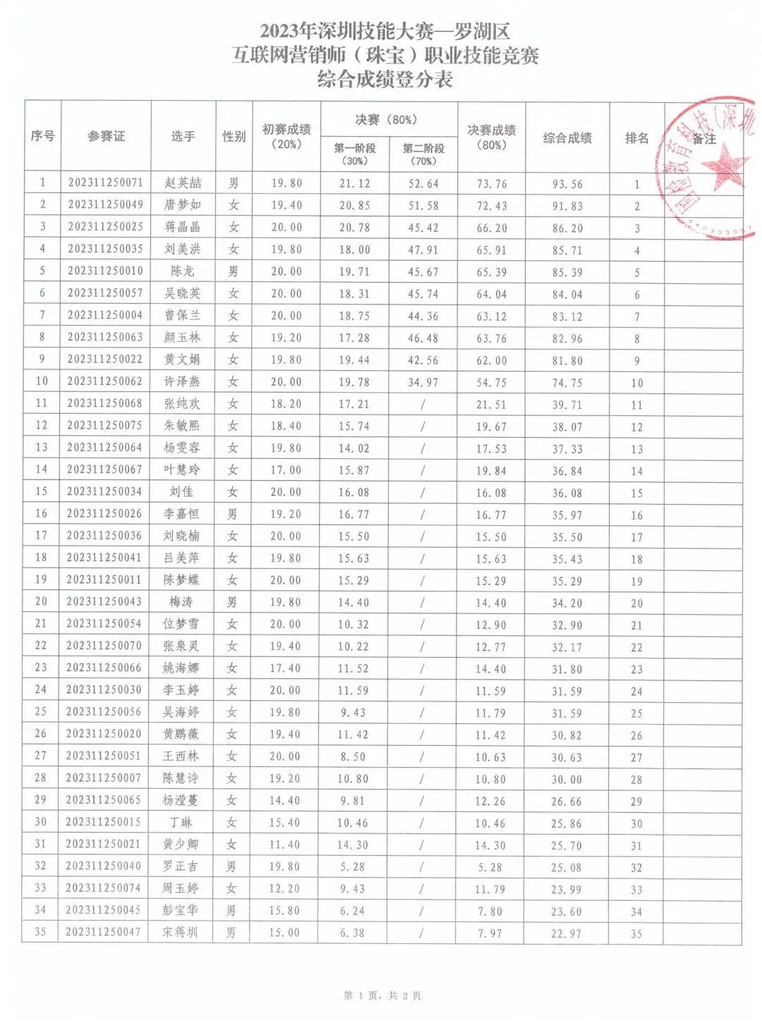 根據《羅湖區互聯網營銷師(珠寶)職業技能競賽方案》要求,競賽組委會于2023年12月3日開展羅湖區互聯網營銷師(珠寶)職業技能競賽決賽已順利結束,現將綜合成績及排名公布表予以公示。