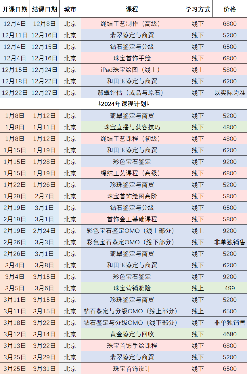 【珠寶國檢集團培訓中心開課計劃】2024年第一季度北京課程計劃來啦!