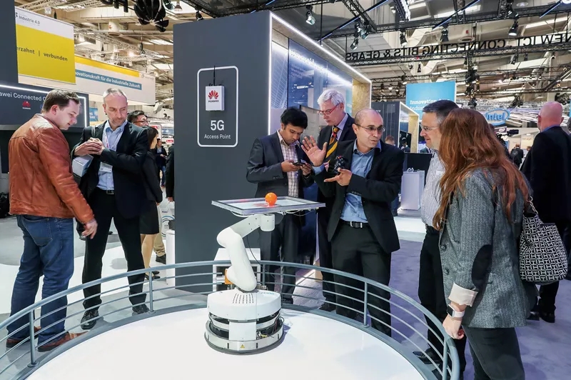 圖為2018年4月24日,在德國(guó)漢諾威工業(yè)博覽會(huì)上,參觀者在華為公司展區(qū)觀看運(yùn)用第五代移動(dòng)通信技術(shù)(5G)操控的機(jī)器人。新華社記者 單宇琦/攝