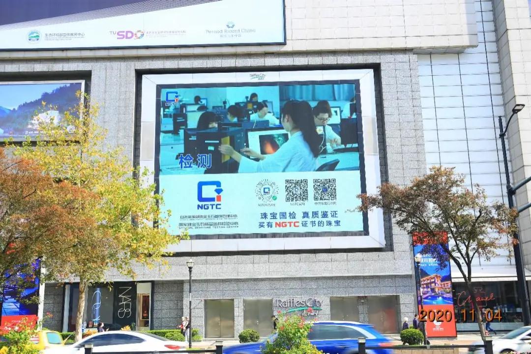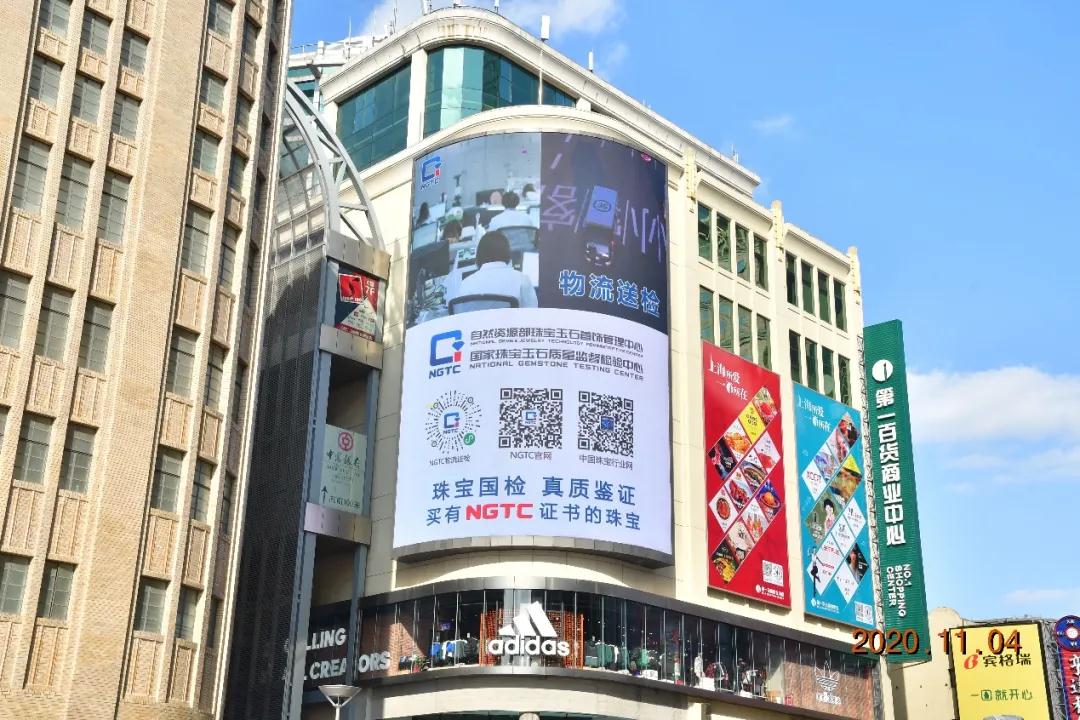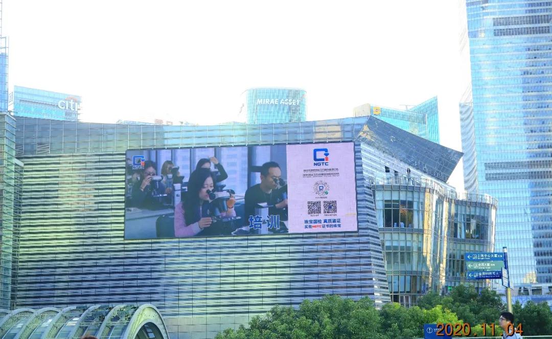 11月4日-10日,上海人民廣場來福士大屏、浦東世紀大道金茂大廈屏、南京東路第一百貨大屏幕上,同期展示珠寶國檢(NGTC)檢測、培訓等服務。大家通過掃描屏幕中的二維碼,即可詳細了解珠寶國檢(NGTC)為消費者提供的專業服務。