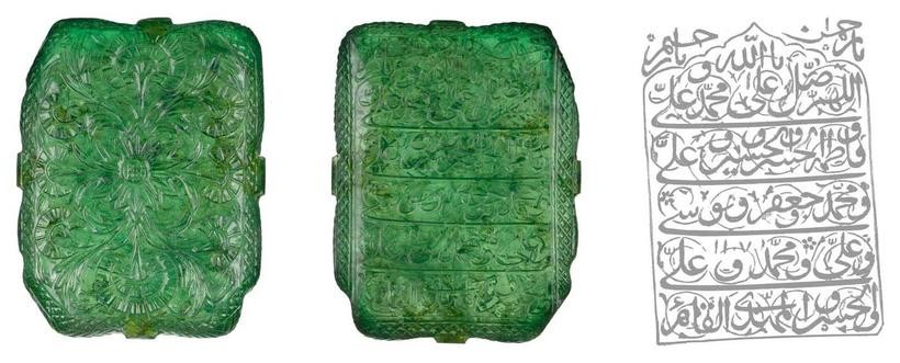 歷史上另一個具有傳奇色彩的哥倫比亞祖母綠——“莫臥兒帝國祖母綠”(Mogul Mughal Emerald),是一塊重量達217.8克拉的祖母綠雕刻件,該祖母綠同樣產自哥倫比亞,曾被17世紀莫臥兒王朝的一位貴族收藏。它正面刻有阿拉伯文祈禱文并且標注了阿拉伯紀年1107年(相當于公元1695年),背面刻有漂亮的花型紋飾。目前這件珍寶在位于卡塔爾多哈的伊斯蘭藝術博物館展出。