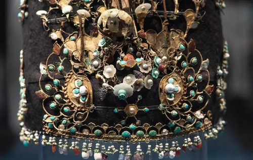 透過這件冠飾的細節可以發現,珍珠均被綠松石、瑪瑙等貴重寶石托了起來,由此可見珍珠在當時受重視的程度。人們發現珍珠不僅珍貴,還有著非常特殊的光澤,像天空中的星河與夜晚的星光,所以常用珍珠來形容女性的溫潤細膩、高貴典雅。