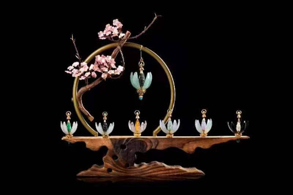 作品融合“蓮花開,真佛現”的創意理念,對翡翠、K黃金、紅藍寶、綠松石、沉香等五寶進行工藝處理,形成完美結合。作品的主體構造由花瓣和花蕊組成,其中花瓣由五片翡翠或貴金屬組成,蘊含“無雜念、無災禍”之意;每一片花瓣內側雕刻觀音菩薩、文殊菩薩、普賢菩薩、地藏王、開心佛等諸佛法相;花蕊則選取釋迦牟尼、黑財神等法相。花瓣與花蕊之間由黃金鑲嵌來實現結合,頂部有蓮花開合保險扣,底部是蓮花開合機關,花開大小由寶主隨心而為。