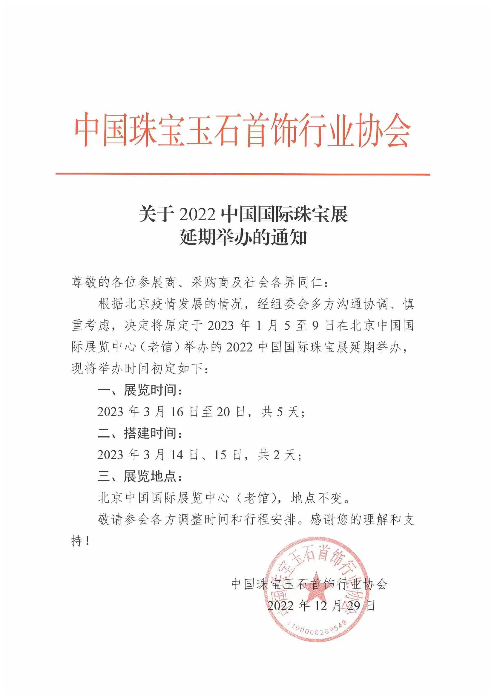 關于2022中國國際珠寶展延期舉辦的通知