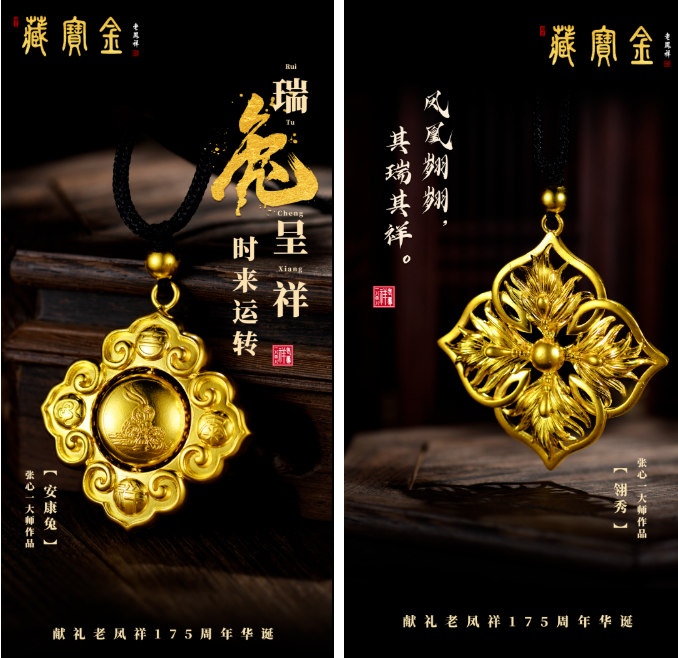 “藏寶金”是老鳳祥貴金屬制品中典藏級高端精品的總稱。老鳳祥“藏寶金”源于古代皇室宮廷文化,經(jīng)過不斷傳承創(chuàng)新,發(fā)展至今。該系列產(chǎn)品是以老鳳祥所獲得的國家級非物質(zhì)文化遺產(chǎn)代表性項目名錄“金銀細工制作技藝”為基礎(chǔ),并結(jié)合現(xiàn)代新工藝所精心制作的首飾、器皿、掐絲琺瑯制品、手編花絲等系列產(chǎn)品,具有高度的美學藝術(shù)鑒賞價值和傳承價值。中國工藝美術(shù)大師張心一獻禮老鳳祥175周年華誕的新力作——《安康兔》與《翎秀》,用獨特的首飾語言展現(xiàn)了中國傳統(tǒng)文化精髓,傳遞美好祝福。