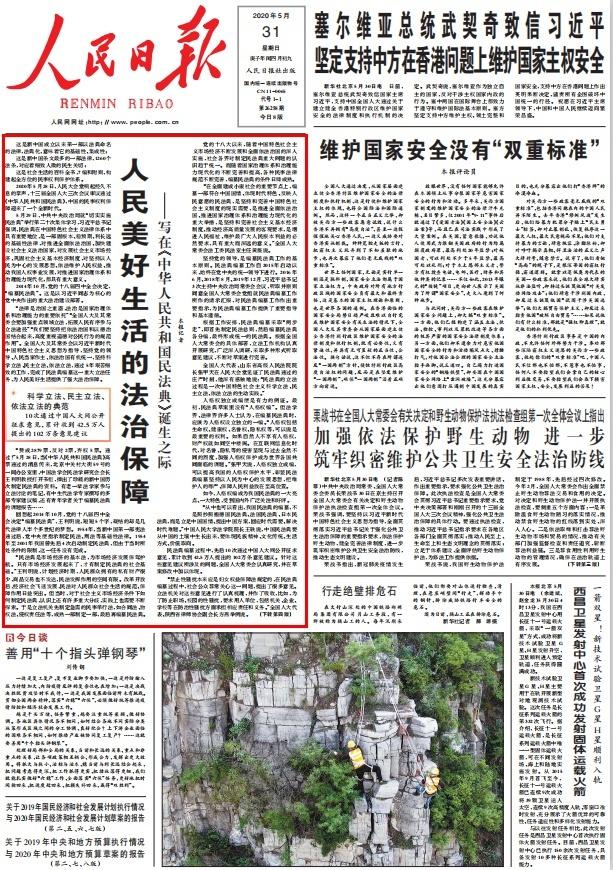 人民日報頭版頭條談民法典誕生:人民美好生活的法治保障